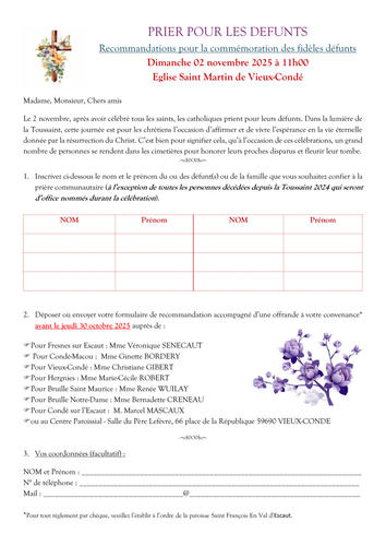 pour les recommandations particulières, des formulaires sont disponibles au fond de l'églisede Condé, au secrétariat de Vieux-Condé et ci-dessous